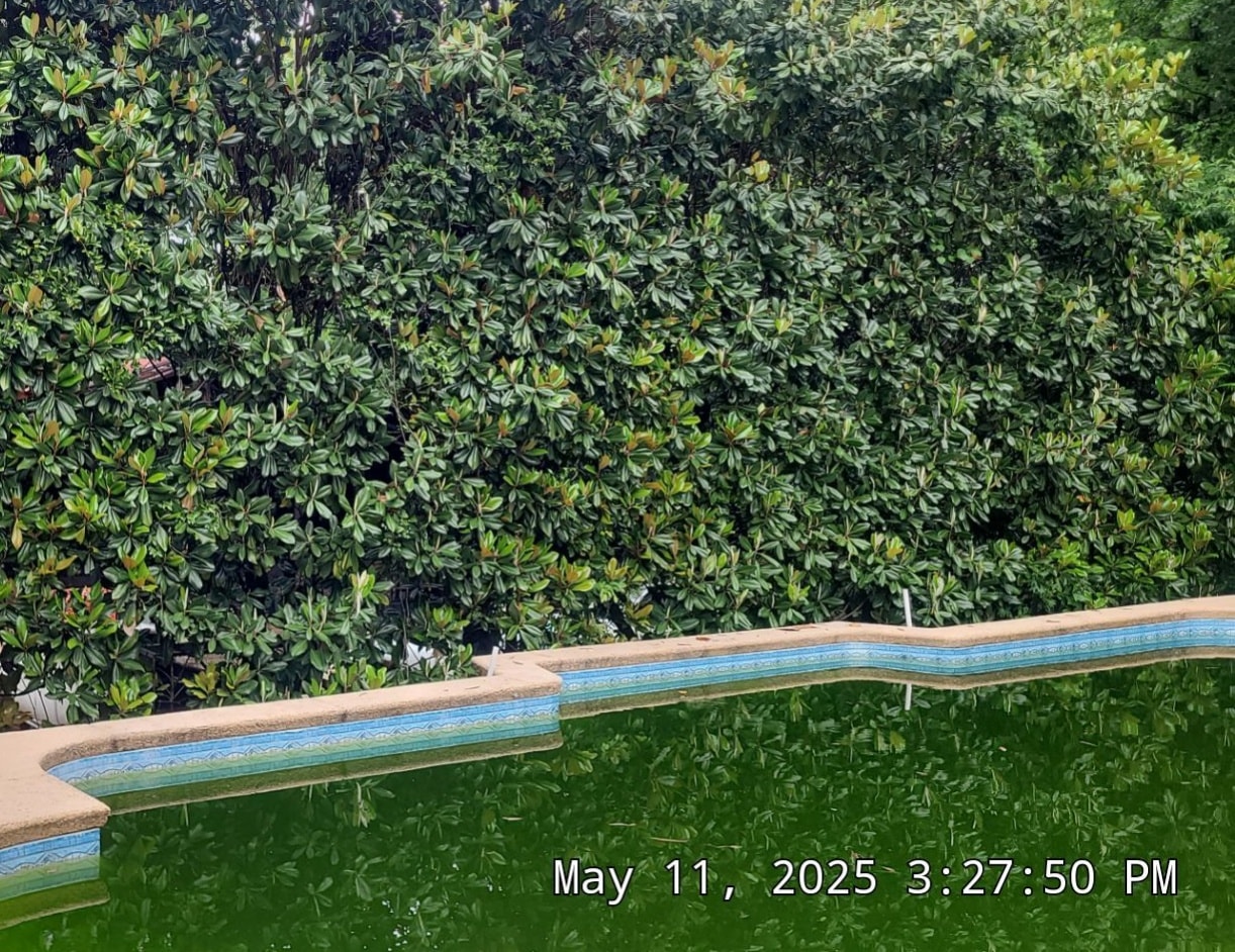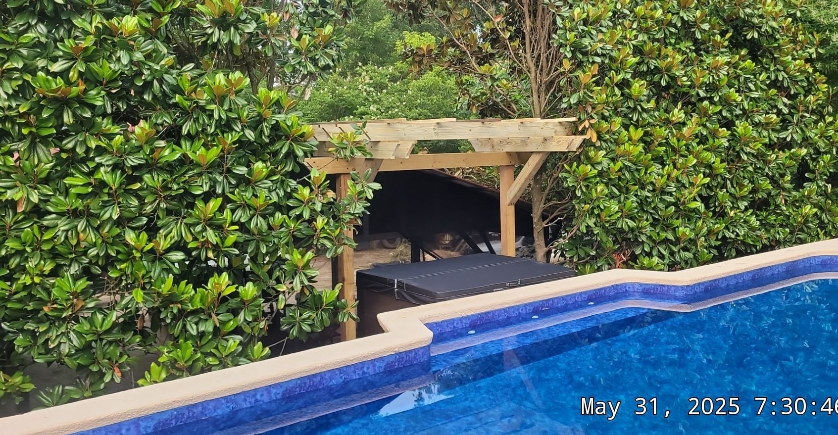 What do you do when you’ve got a new hot tub and you want it right next to the pool centered with one of the architectural elements, but there’s a huge hedge row that come right up to the side of the pool? You call Landscapes Unlimited of coure!